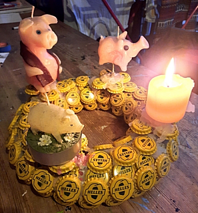 Und auf unserem Adventkranz sitzen, wie es sich für ein fröhliches Wohnzimmer gehört, drei wunderschöne Schweinekerzen. close