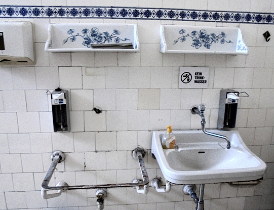 dieses foto zeigt den vorraum zur toilette im theater am steinhof. ein wunderschöner bau, den die gemeinde wien, oder wer auch immer zuständig ist, leider etwas verkommen lässt. ilse und ich haben dort eine kleine kunstmesse besucht.