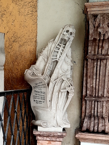 dieses gerippe steht am grab des bürgerlichen glasermeisters florian rehle, der von 1811 bis 1850 in salzburg lebte.